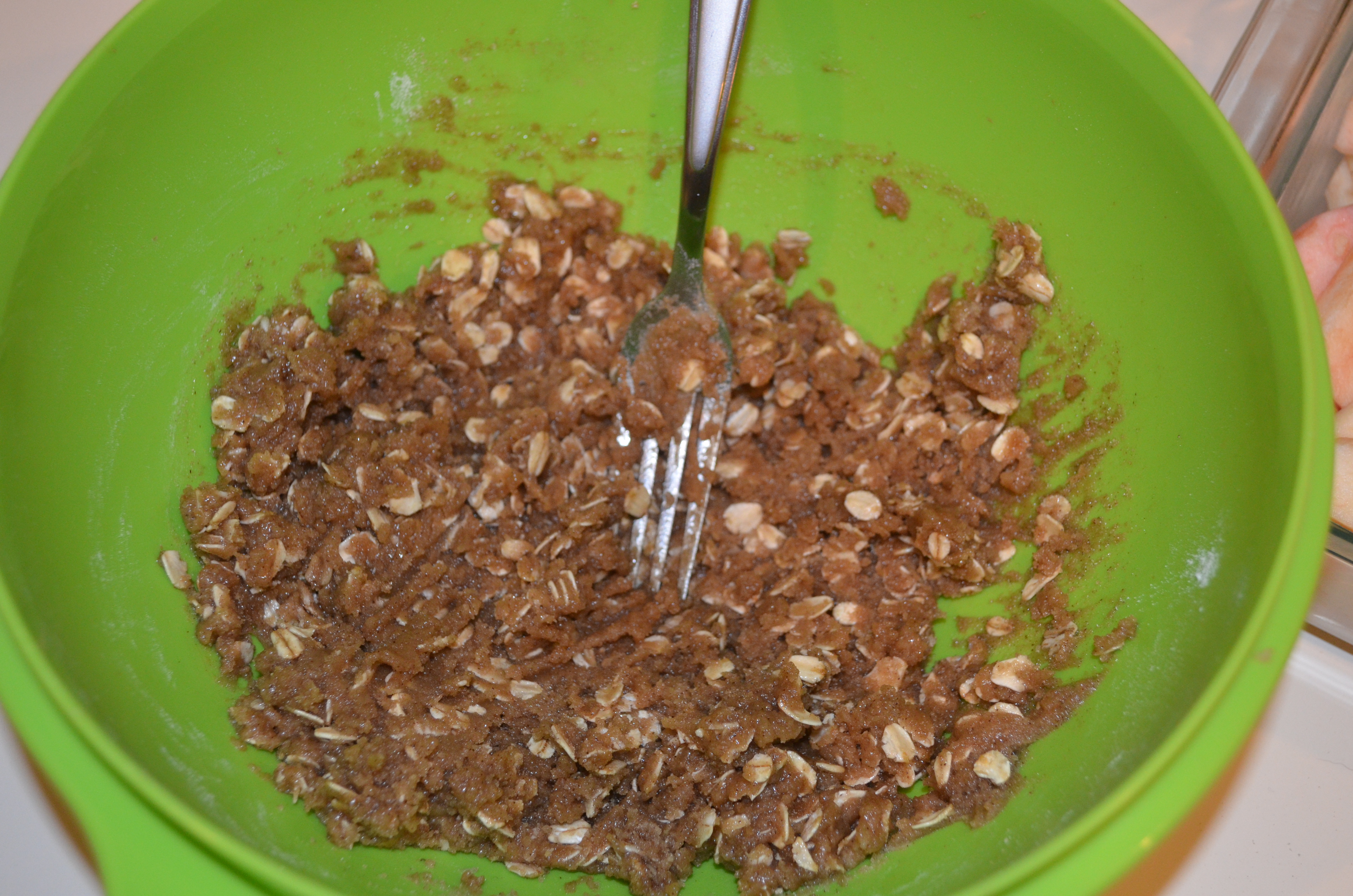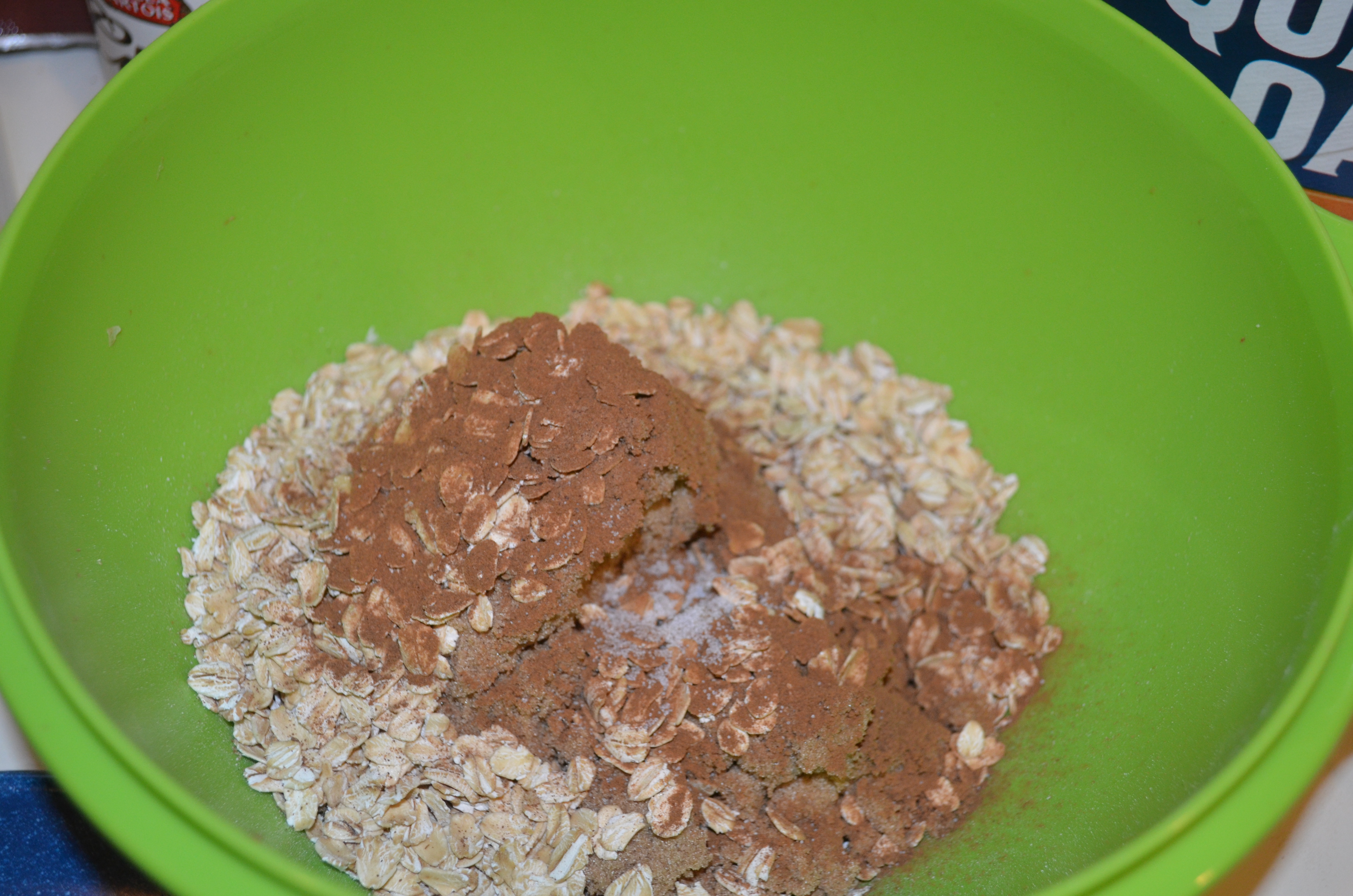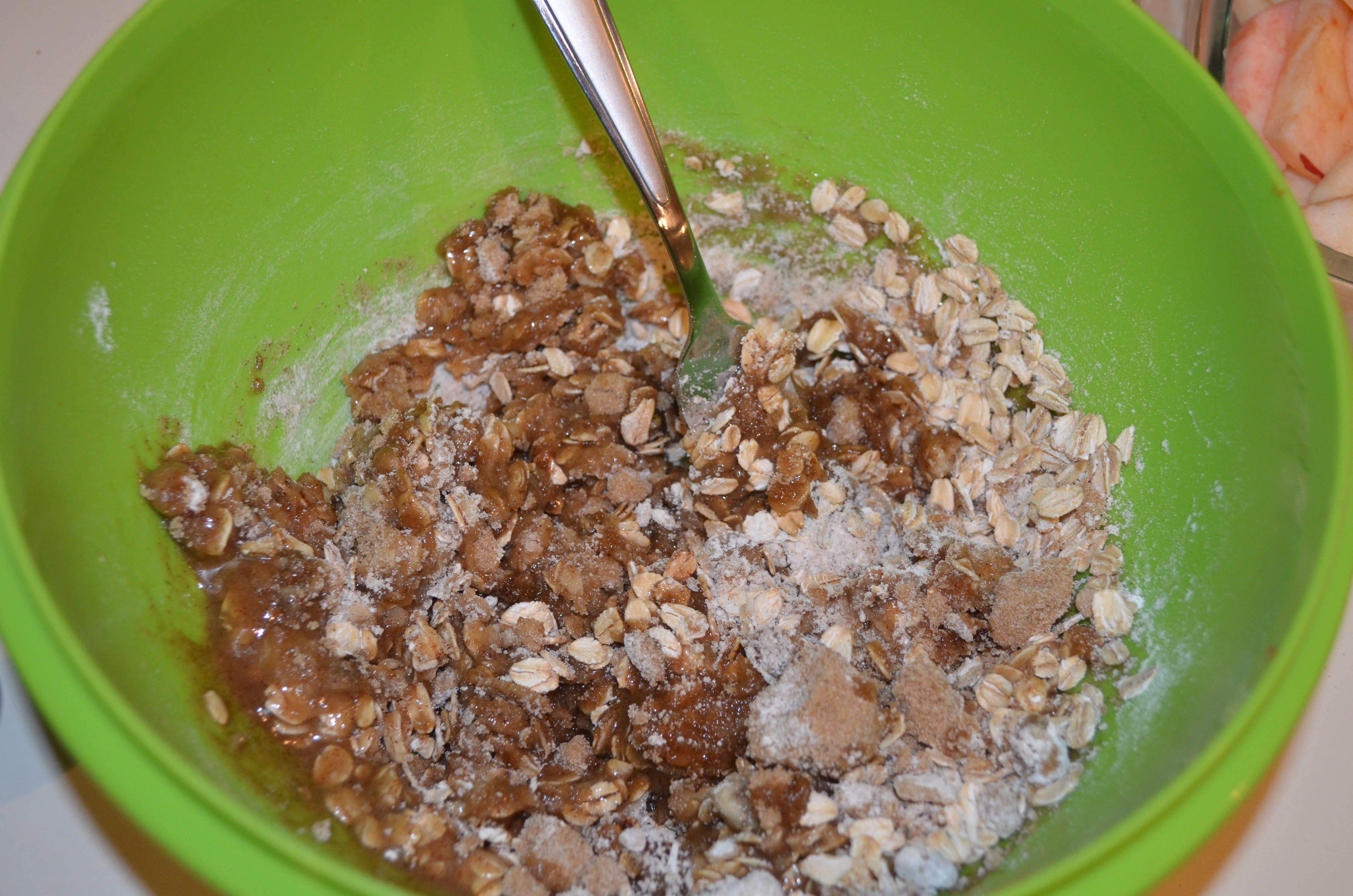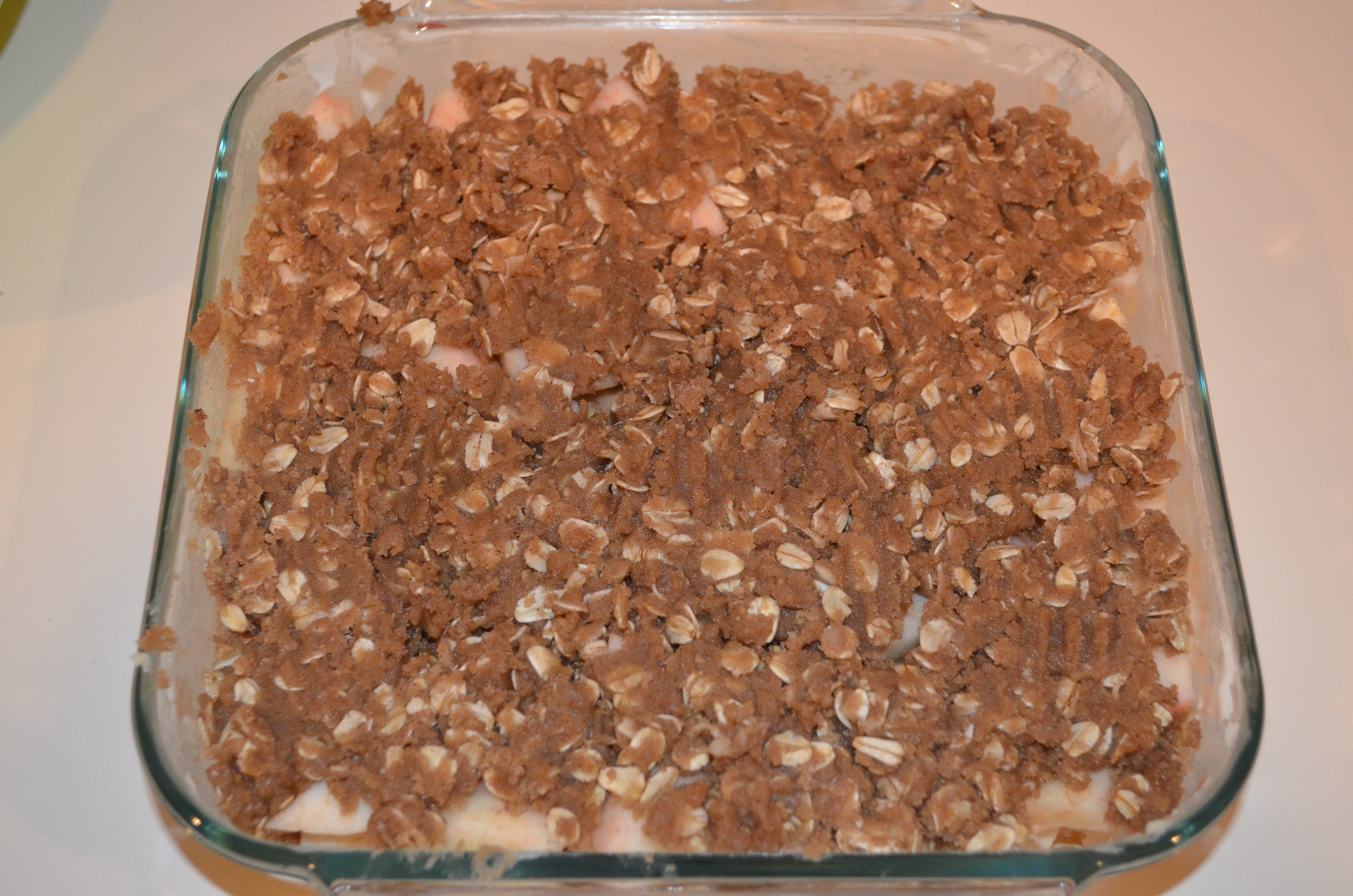 Preheat oven to 375 degrees. Put apples on bottom of greased dish. Mix remaining ingredients. Sprinkle over apples, completely covering them. Bake for 30-35 mins. Serve warm with vanilla ice cream.
